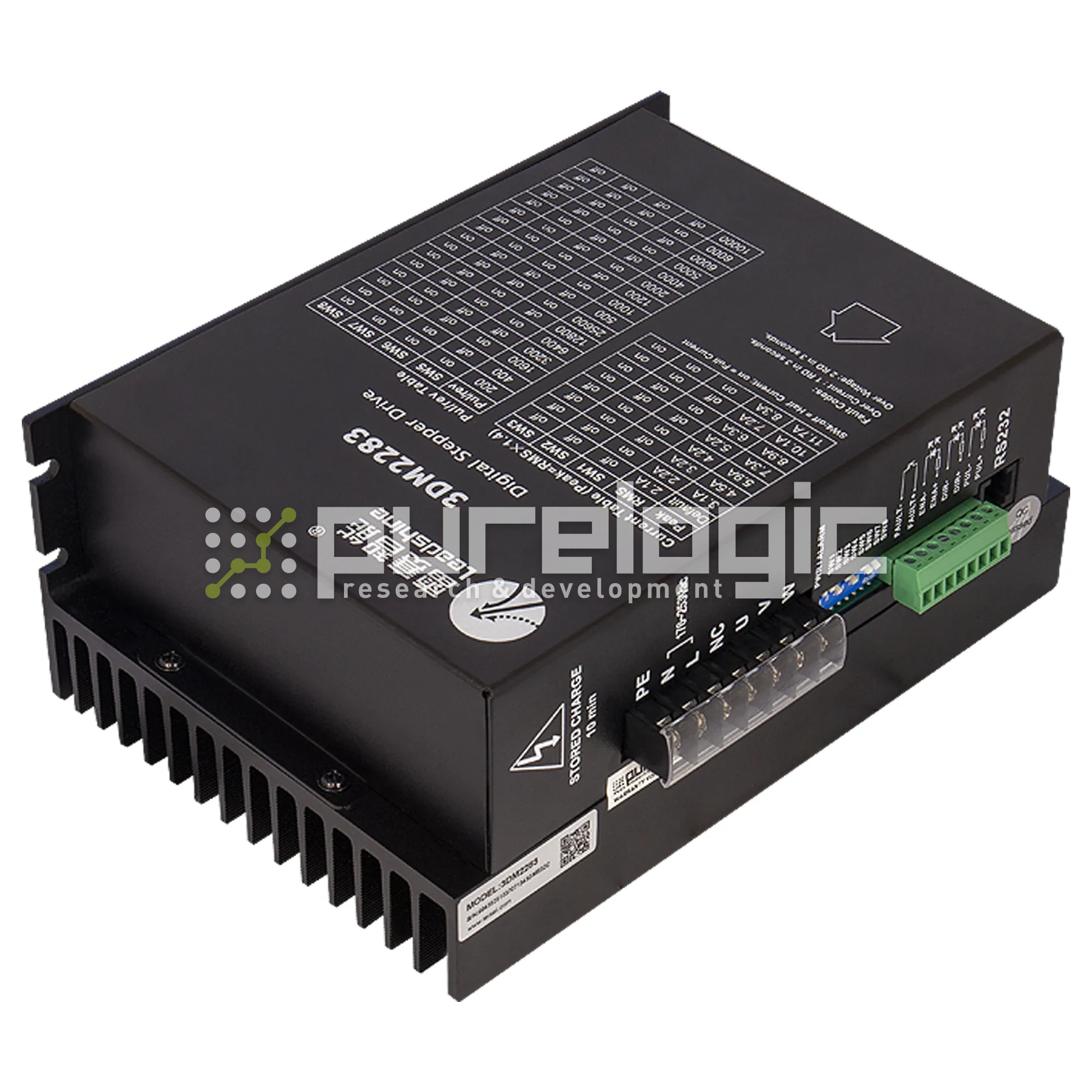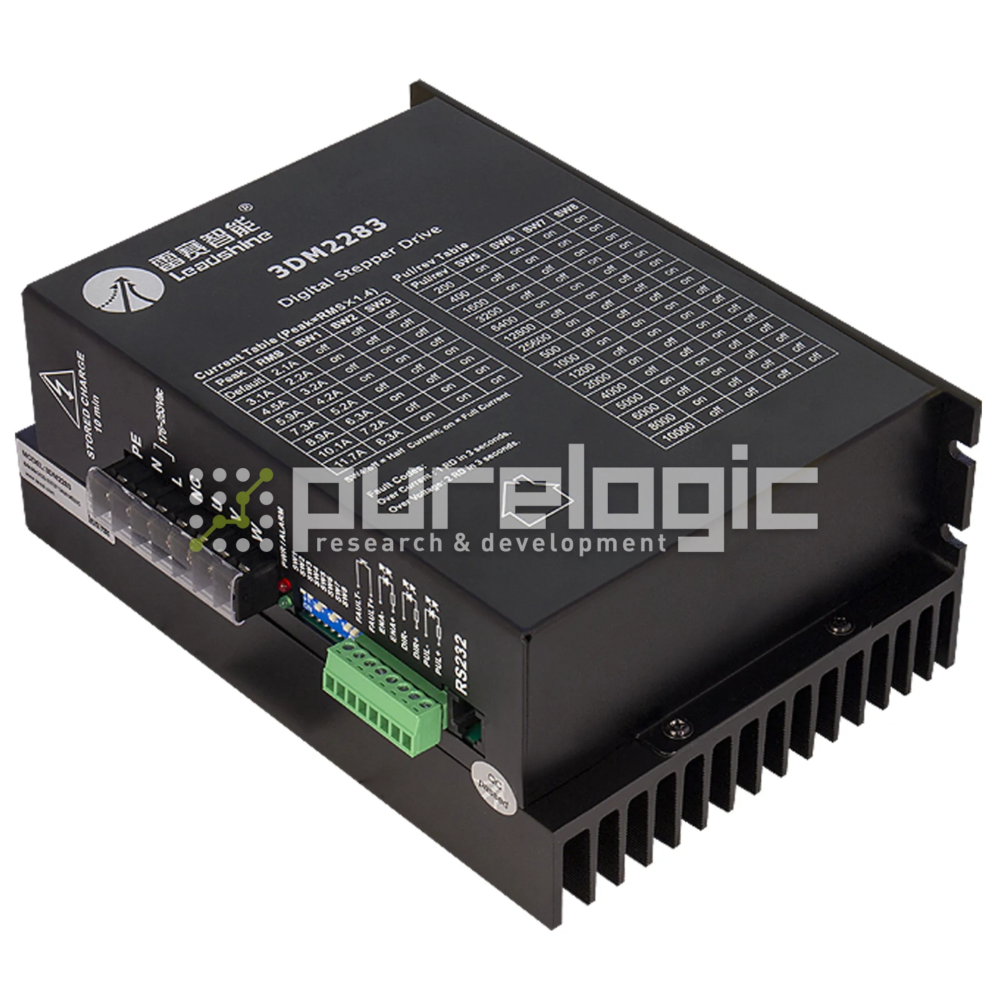 Драйвер трёхфазного шагового двигателя Leadshine 3DM2283 ~220В/8.3А/200кГц. Деления шага от 1:2 до 1:512. Оптоизолированные входы управления STEP, DIR, ENABLE. Выбор режима работы STEP/DIR или CW/CCW. Настройка драйвера с ПК через RS232, автонастройка под ШД. Компенсация резонанса и определение останова ротора ШД. Защита от КЗ обмоток ШД, от обратной ЭДС ШД, режим удержания ротора ШД.