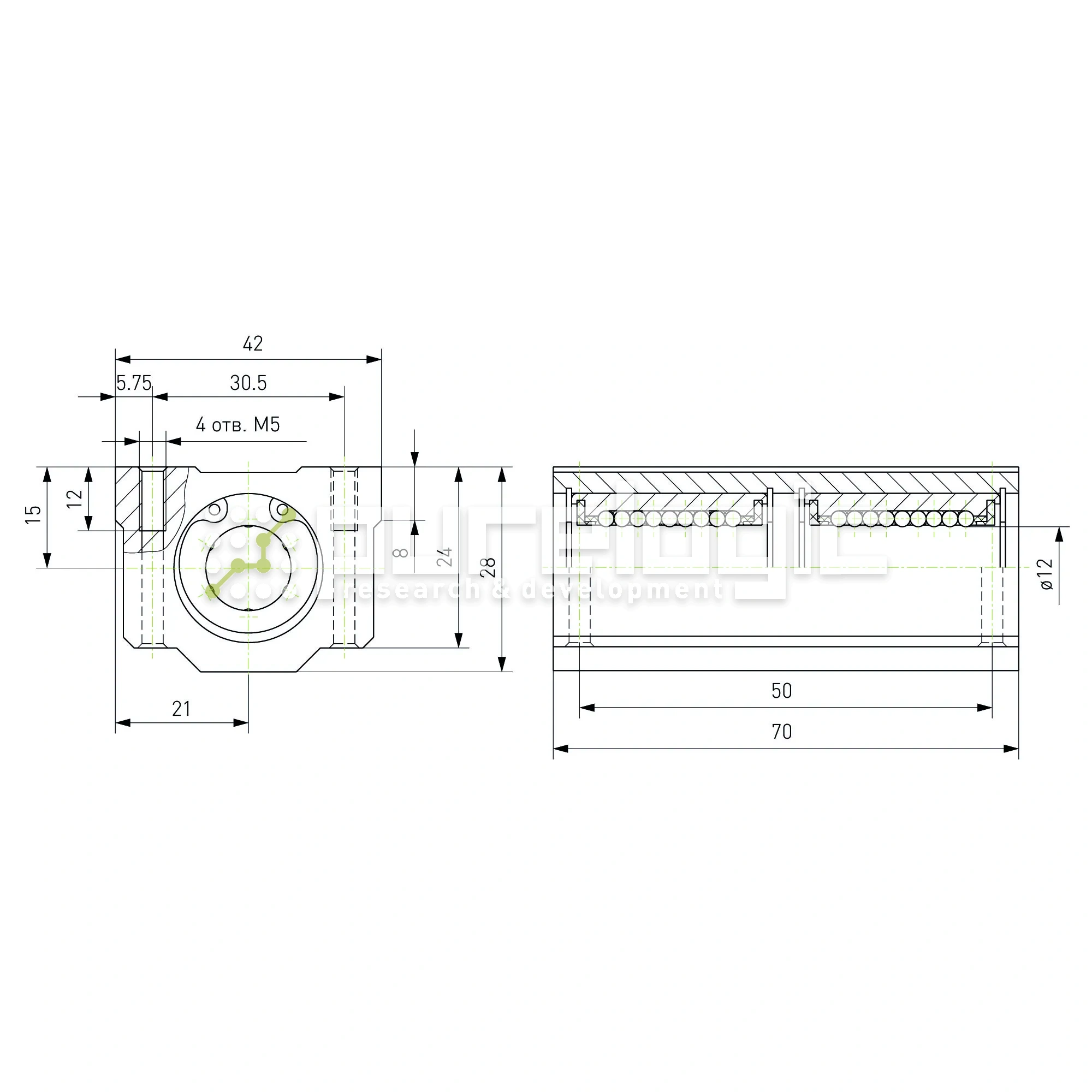 Удлиненный опорный модуль (линейный подшипник качения) на вал Ø12мм. Предназначен для работы с полированными и закаленными направляющими валами. Внутри корпуса установлены две шариковые втулки. Корпус выполнен из алюминиевого сплава и оснащен монтажными отверстиями для крепления к плоскому основанию. Характеризуется динамической грузоподъемностью 83кгс и статической грузоподъемностью 160кгс.