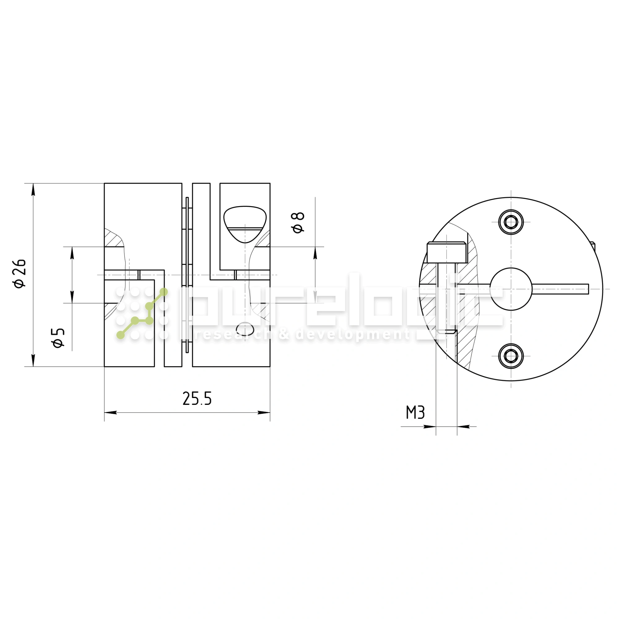 Корпус разборный, две полумуфты из алюминиевого сплава соединены стальными мембранами. Фиксируются на валу затяжкой, с помощью винта. Муфта применяется в узлах, где требуется компенсация несоосности валов и угла между валами. Передает высокий крутящий момент, обеспечивает безлюфтовую передачу, обладает большой скоростью вращения, аналогична карданному соединению. D=26мм, L=25.5мм, d1=5мм, d2=8мм, момент 16Н*м.