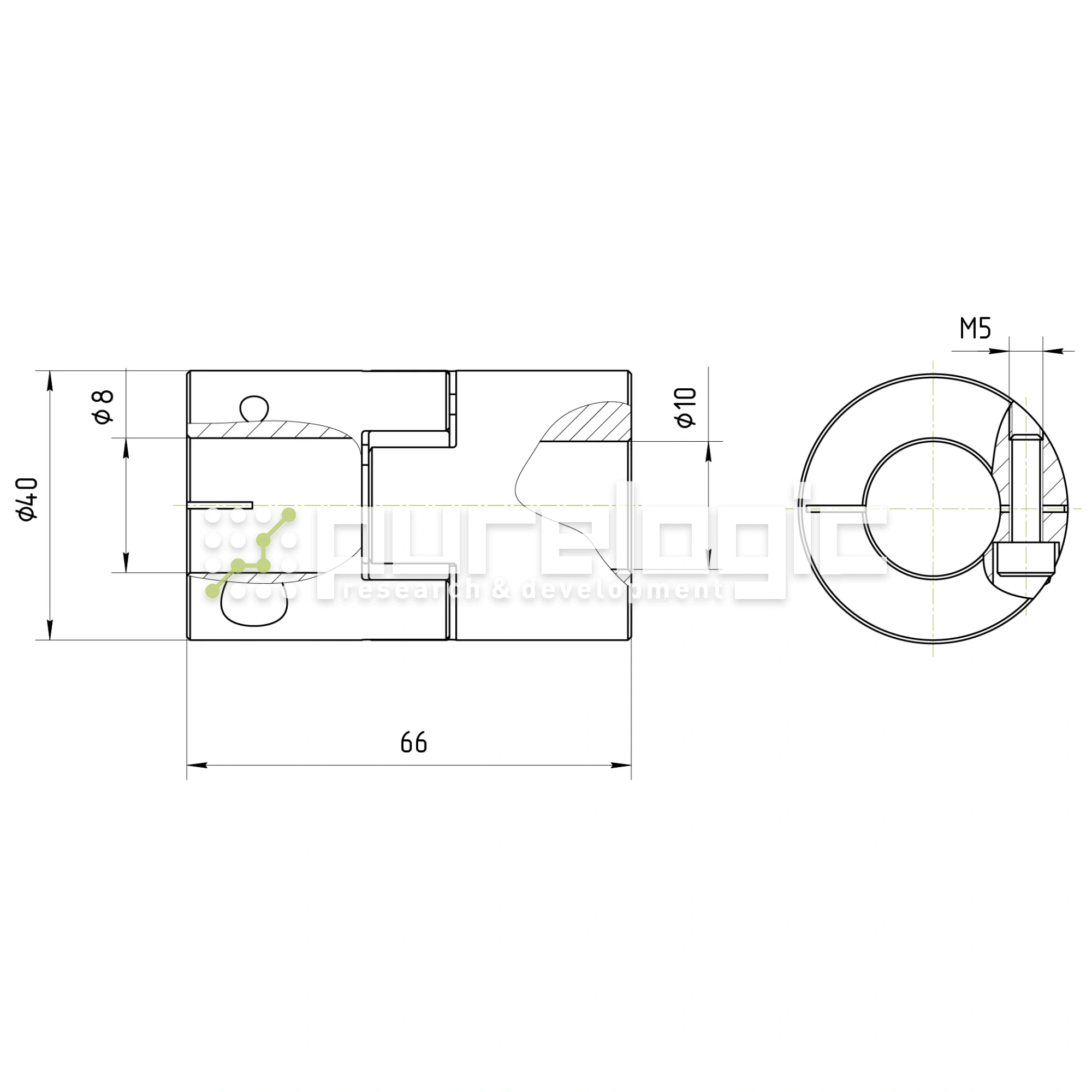 Корпус разборный, две полумуфты из алюминиевого сплава соединены амортизирующей полиуретановой вставкой. Фиксируются на валу затяжкой, с помощью винта. Муфта применяется в узлах, где требуются компенсации несоосности валов и угла между валами. Передает высокий крутящий момент, поглощает вибрации. При высокой нагрузке, полиуретановая вставка подвержена нормальному износу, в передаче может возникать люфт. D=40мм, L=66мм, d1=8мм, d2=10мм, момент 20Н*м.
