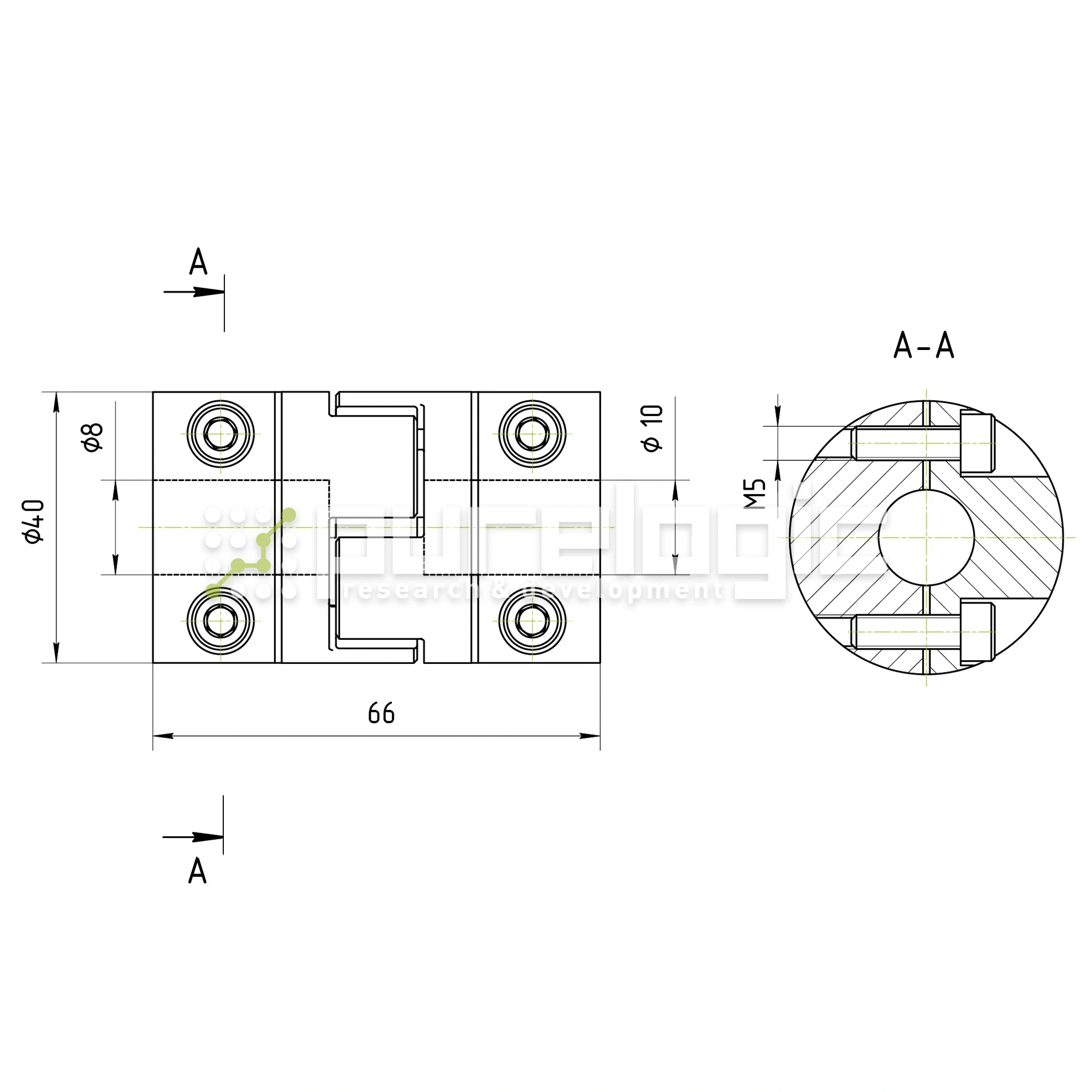Корпус разборный, две полумуфты из алюминиевого сплава соединены амортизирующей полиуретановой вставкой. Каждая полумуфта фиксируется на валу затяжкой, с помощью двух винтов (допускается радиальный монтаж муфты). Муфта применяется в узлах, где требуются компенсации несоосности валов и угла между валами. Передает высокий крутящий момент, поглощает вибрации. При высокой нагрузке, полиуретановая вставка подвержена нормальному износу, в передаче может возникать люфт. D=40мм, L=66мм, d1=8мм, d2=10мм, момент 16Н*м.