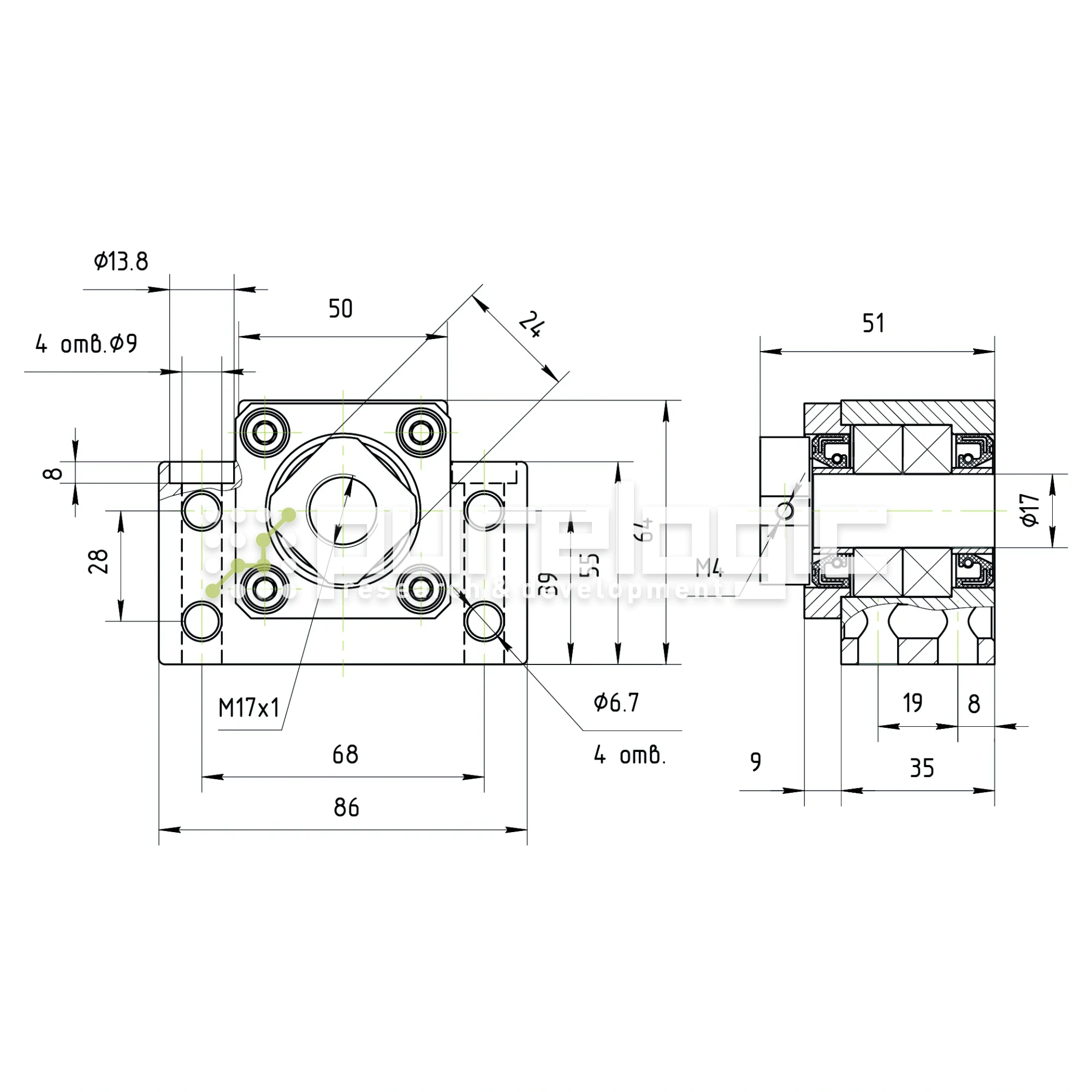 Опора для фиксации приводного конца винта передачи. В опоре установлены два радиальных подшипника класса P6, позволяющих зафиксировать винт в радиальном и осевом направлениях. Класс C7. D=17мм
