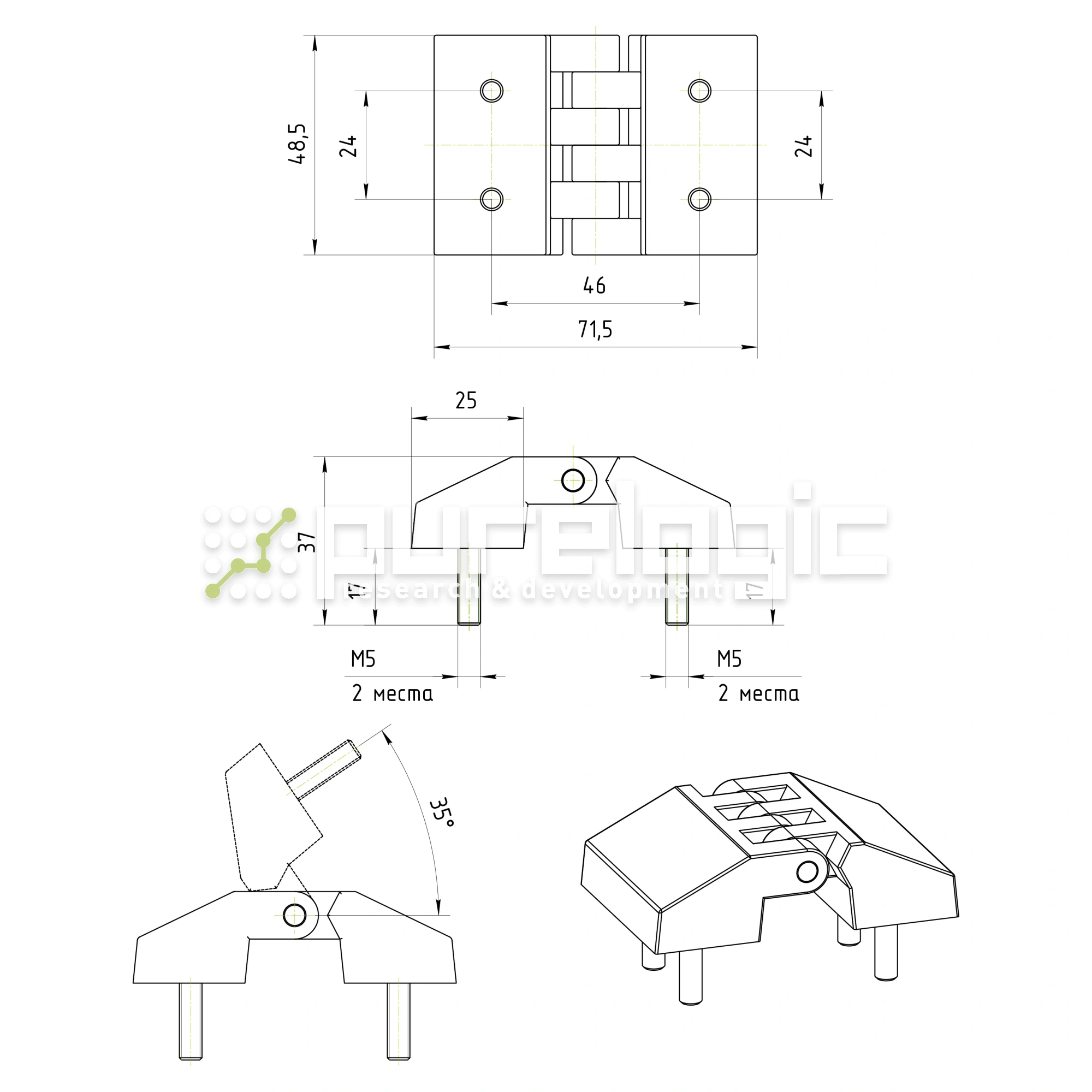 Петля для производства промышленной мебели. 71,5х48,5мм, 4 шпильки М5