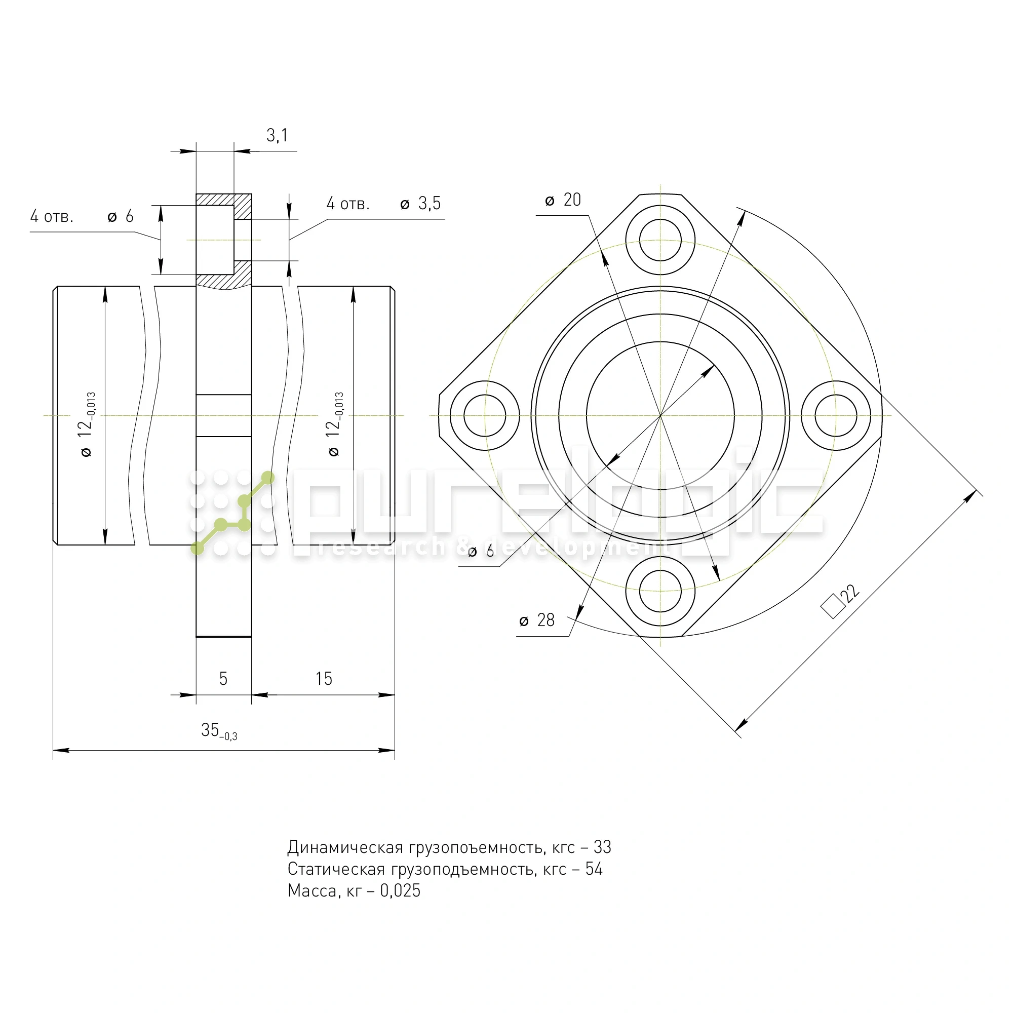 Удлинённый линейный подшипник на вал Ø6мм. С квадратным фланцем по центру.