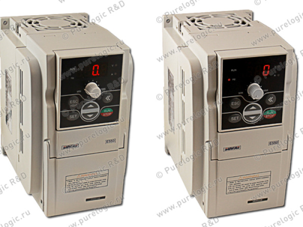 Общепромышленные частотные преобразователи серии E550. Частота до 1000Гц. Векторное/скалярное управление. RS485 + Modbus. Функции PLC - встроенный счетчик и ПИД регулятор для построения несложных систем регулирования с обратной связью (термостат и пр.). Защита от перегрузки по току, перегреву, КЗ и превышению напряжения питания.
